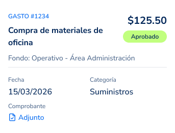 Registra cada gasto asociado al fondo correspondiente, carga comprobantes y genera rendiciones de forma simple y ordenada